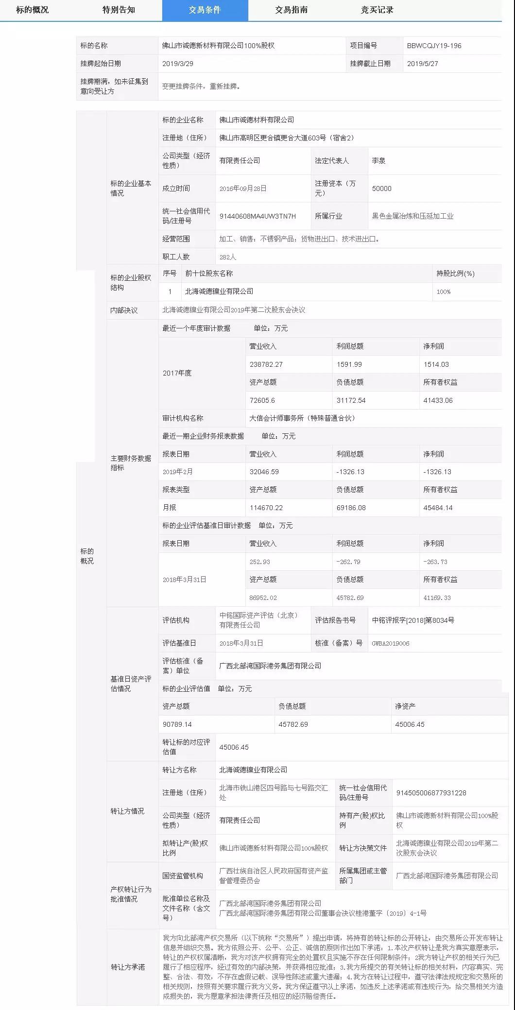 【中国铁合金网讯】2019年3月29日,佛山市诚德新材料有限公司100%股权在北部湾产权交易所集团被挂牌交易,转让方:北海诚德镍业有限公司,挂牌价5.38亿,保证金2.7亿。标的资产总额9.1亿,负债总额4.6亿,净资产4.5亿,对应评估值4.5亿。