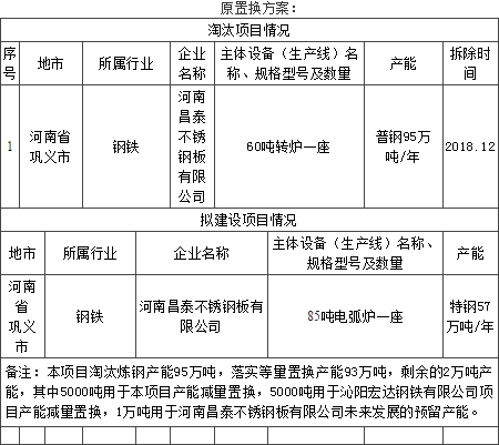 【中国铁合金网讯】按照《国务院关于化解产能严重过剩矛盾的指导意见》 《国务院关于钢铁行业化解过剩产能实现脱困发展的意见》和《钢铁行业产能置换实施办法》要求,根据河南昌泰不锈钢板有限公司申请,经我局核实并报巩义市人民政府确认,同意对河南昌泰不锈钢板有限公司原60吨转炉产能置换方案进行变更,现予以公告,欢迎社会公众进行监督。联系电话:64581056