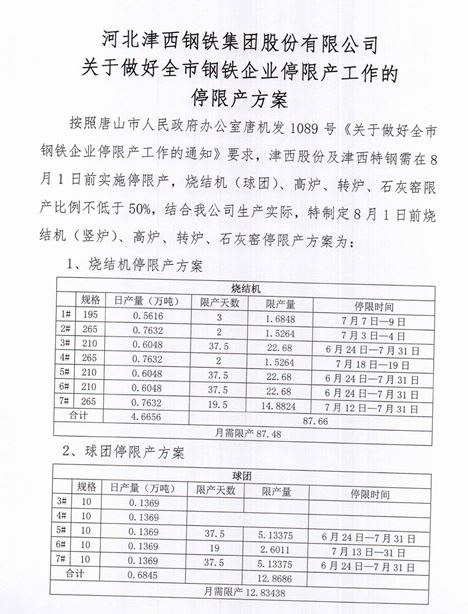 【中国铁合金网讯】据市政府办印发的《关于做好全市钢铁企业停限产工作的通知》要求,我县唯一一家钢铁企业即津西钢铁集团烧结机(球团)、高炉、转炉、石灰窑限产比例不低于50%,具体停限产设备及比例见附件,企业停限产工作监管责任人为张志宏(迁西县工信局党组书记,13931456466),分管县领导为刘永宏(迁西县政府副县长,5610988)。
