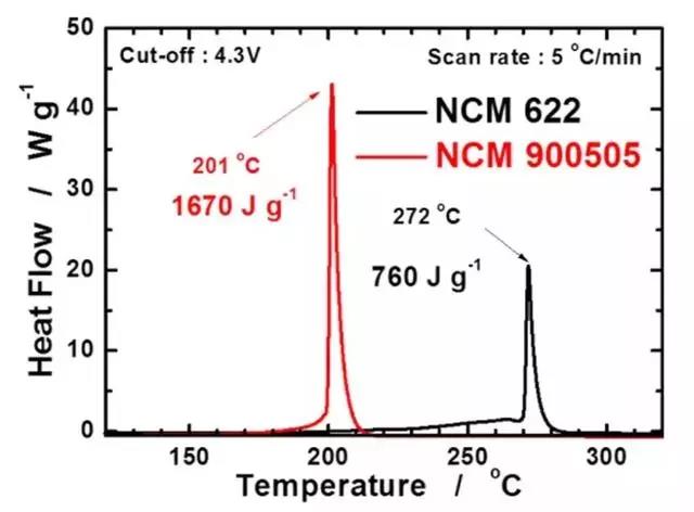 提高Ni含量也面临同样的问题,相比于NCM622材料,NCM900505材料的不仅循环性能大幅下降,在热稳定性上也出现了明显的降低。在高电压下NCM900505无论是在热分解温度,还是在放热量方面也都要显著差于NCM622材料[4],这对应了高镍材料在电芯中较差的安全性。