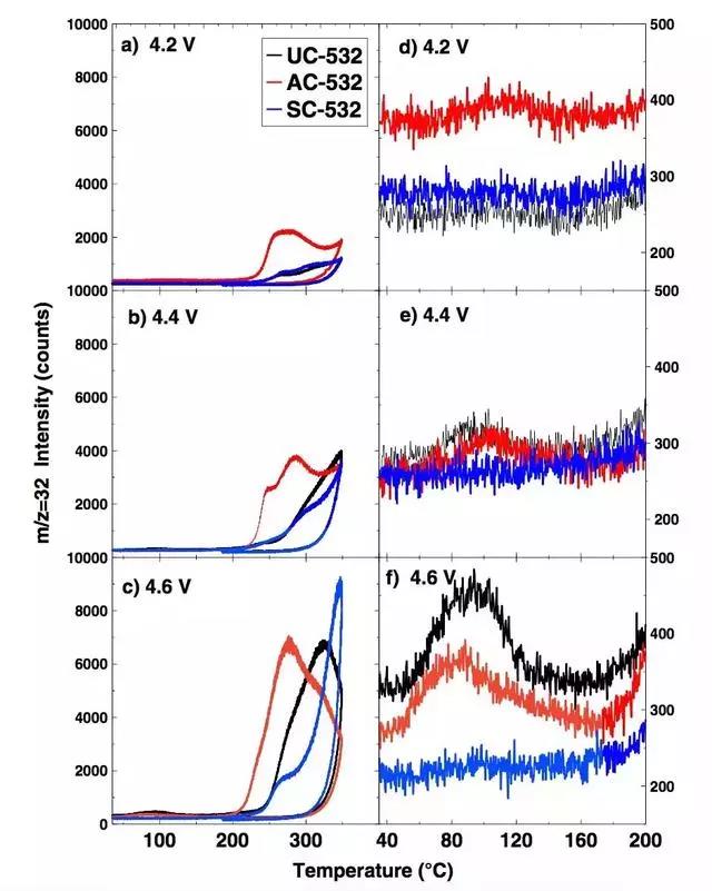 近期多起电动汽车自燃事故,将电动汽车的安全性问题推上了风口浪尖,前面我们已经介绍过随着Ni含量的提高会导致材料的热稳定性下降,而单晶材料由于晶体结构更加稳定,因此热稳定性也会相应提高,O2释放量实验表明单晶NCM523材料不但在80℃附近没有O2释放,而且在200-350℃范围内的O2释放峰的温度也要高于二次颗粒NCM523材料[5],这也表明单晶材料在热稳定上具有一定的优势。