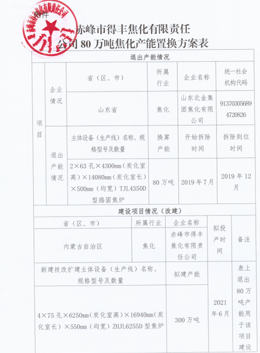 【中国铁合金网讯】按照《国务院办公厅关于石化产业调结构促转型增效益的指导意见》精神、《焦化行业准入条件》(2014年修订)和《内蒙古工业和信息化厅关于进一步规范化工行业项目建设的若干规定》要求,现将赤峰市得丰焦化有限责任公司80万吨焦化产能置换方案予以公示,公示时间为公示发布之日起五个工作日,欢迎社会公众进行监督。