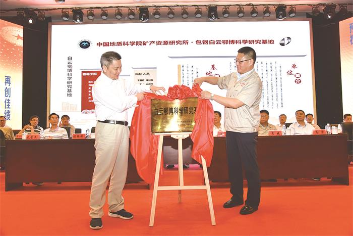 仪式上,刘振刚与陈仁义分别代表包钢(集团)公司与中国地质科学院矿产资源研究所,为白云鄂博科研基地成立揭牌。