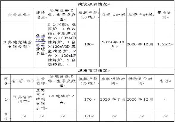 新建冶炼设备炼钢产能来自于江苏省徐州市江苏宝丰特钢有限公司,其拟退出产能为170万吨,启动拆除时间2020年7月,拆除到位时间2020年12月。