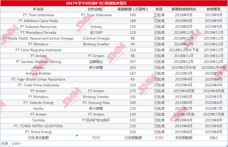 8月初有三家矿山获得了配额。其中,Toshida获得了192万湿吨的镍矿出口配额,此前该矿山的192万湿吨配额于2019年1月份到期,一度暂停出货。据悉,目前该矿山已装完一船镍矿,月出货量约16.5万湿吨。