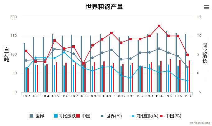 中国铁合金网讯:2019年7月全球64个纳入世界钢铁协会统计国家的粗钢产量为1.567亿吨,同比提高1.7%。