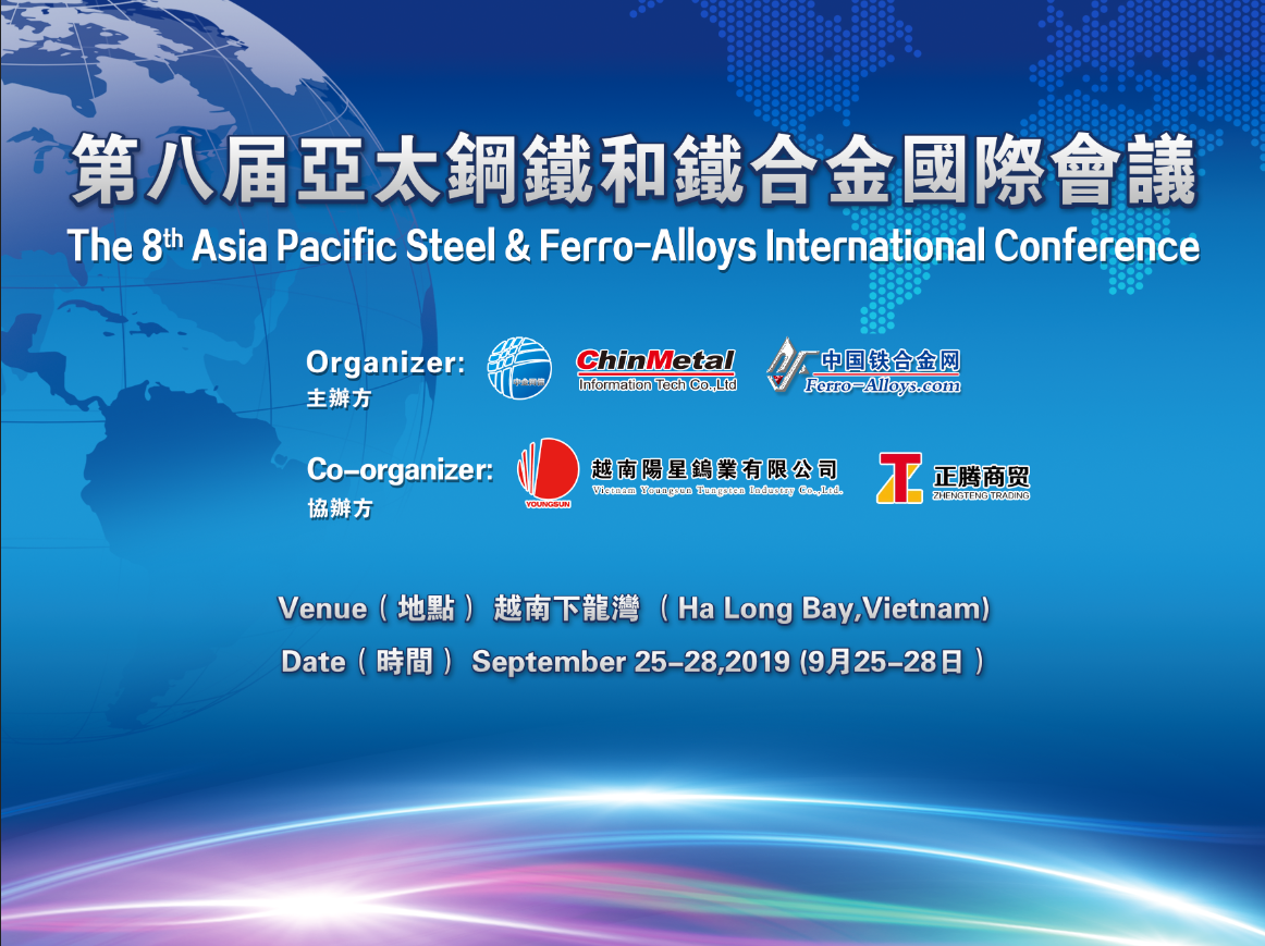 由中国铁合金网(Ferro-Alloys.com) 主办、越南阳星钨业有限公司,正腾商贸协办、国际冶金资源工业协会、国际铁合金工业协会支持的 “第八届亚太钢铁和铁合金国际会议”将于2019 年9 月25 日-28 日在越南下龙湾召开。详情点击图片报名参加。
