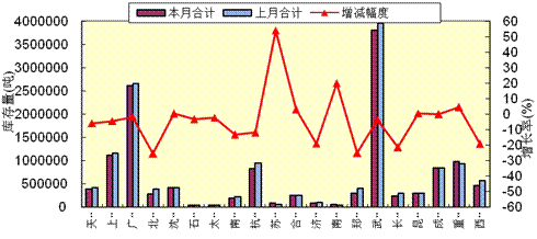 本月螺纹钢库存环比增加的地区有5个,其中增加较多的地区有沈阳,库存环比增加1.0万吨,苏州2.8万吨,合肥1.0万吨,南昌0.1万吨,成都2.0万吨;本月库存环比减少的地区有12个,其中减少较多的地区有天津,库存环比减少2.5万吨,其中钢材市场减少2.2万吨,港口减少0.3万吨;上海库存环比减少1.8万吨,全部为钢材市场减少量;广州库存环比减少3.6万吨,其中钢材市场减少8.0万吨,港口库存增加4.4万吨;北京库存环比减少9.0万吨,南京2.7万吨,杭州7.9万吨,济南0.3万吨,郑州4.5万吨,武汉7.9万吨,长沙4.1万吨,西安6.8万吨。