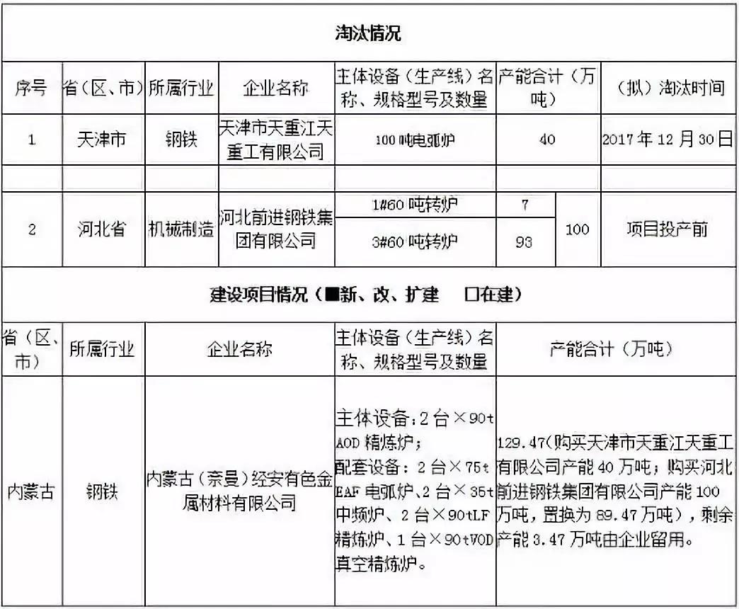 注:从河北前进钢铁集团有限公司购买的产能100万吨,河北省人民政府于2017年12月27日在河北省人民政府网站公告,置换为89.47万吨。