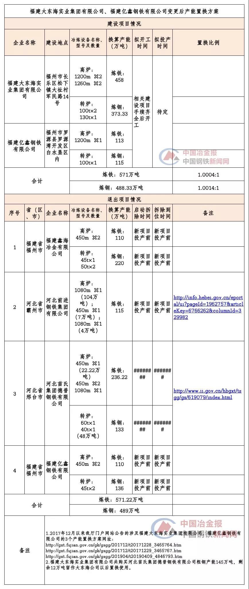 从最新的产能置换方案可以看出,福建大东海实业集团有限公司和福建亿鑫钢铁有限公司将承接福建鑫海冶金有限公司、河北前进钢铁集团有限公司、河北苗氏集团德普钢铁有限公司、福建亿鑫钢铁有限公司的产能,新建5座高炉、4座转炉,合计炼铁产能571万吨、炼钢产能488.33万吨。