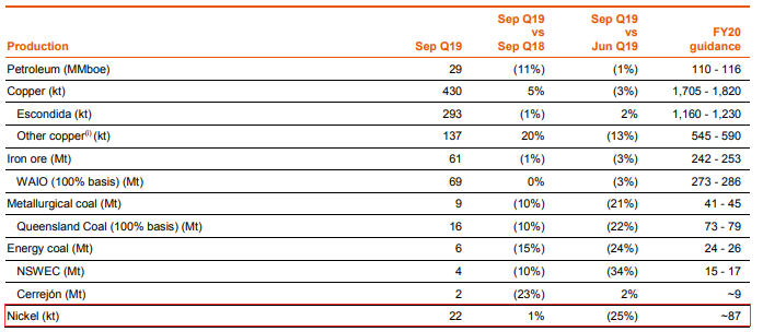 【中国铁合金网讯】近日,必和必拓发布其三季度财报,必和必拓首席执行官Andrew Mackenzie表示:“通过整个投资组合的持续强劲运营业绩,我们为2020财政年度打下了坚实的开端。尽管由于计划维护和石油自然采收率下降的预期影响,该季度的集团产量略有下降,但指导仍保持不变,我们有望实现比上一财年略高的产量。 South Flank铁矿石项目已完成50%,我们的所有主要项目均按计划和预算进行。 我们在石油和Oak Dam铜矿勘探方面取得了令人鼓舞的勘探结果。”