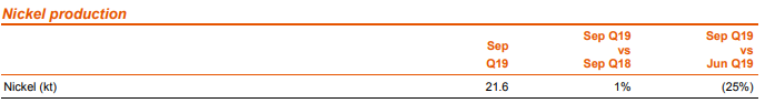 West Nickel的产量同比增加了1%,达到22 kt,这反映了2018年9月大火之后Kalgoorlie冶炼厂的产量增加。Kwinana精炼厂和Kalgoorlie冶炼厂的四年一次重大维护停工计划于2019年12月季度进行。2020财年的生产指南保持不变,产量预计将与2019财年基本一致。