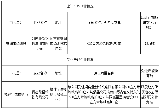 【中国铁合金网讯】按照《国务院关于化解产能严重过剩矛盾的指导意见》(国发〔2013〕41号)、《工业和信息化部关于印发钢铁水泥玻璃行业产能置换实施办法的通知》(工信部原〔2017〕337号)要求,安阳市工业和信息化局于2019年12月6日至2019年12月13日对河南亚新钢铁集团有限公司1座630立方米炼铁高炉产能出让情况进行了公示,公示期未收到任何异议。现将河南亚新钢铁集团有限公司产能出让情况予以公告,欢迎社会公众进行监督。