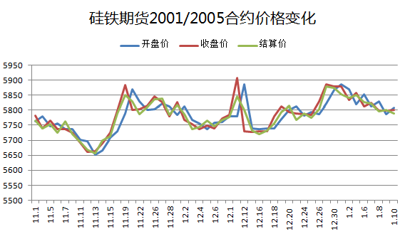【期货行情】本周硅铁期货2005合约开盘价5852,最高价5866,最低价5762,收盘价5800,涨幅-0.85%,结算价5790,成交总量10.65万手,持仓量45518。