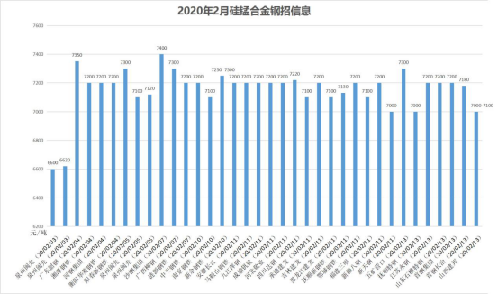 太钢2020年2月份硅锰招标价7050元/吨,环比上涨550元。