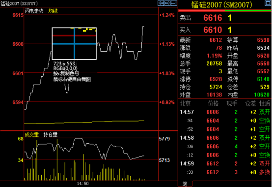 硅锰期货2005主力合约临近交割月,重心转移至硅锰2007合约。今日硅锰期货05合约收盘价:6708,跌幅0.09%,最高6794,结算6706,成交量104027。本周一高开之后,一直处于跌跌涨涨趋势,跌宕较小。