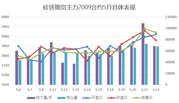 【期货行情】本周硅铁期货主力2009合约开盘价5850,最高价5992,最低价5782,收盘价5880,结算价5920,持仓量67923,成交量382246。