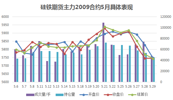【期货行情】本月硅铁期货盘面上涨,2009合约开盘价5850,最高价5992,最低价5726,收盘价5744,结算价5744,持仓量45518,成交量1118472。