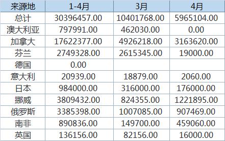 【中国铁合金网讯】美国商务部公布的数据显示,美国4月镍进口量为5,965,104千克,低于3月的10,401,768 千克。
