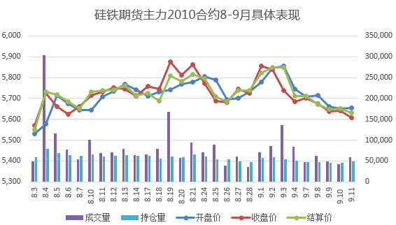 【期货行情】本周期货盘面总体阴跌下行,硅铁期货主力2010合约开盘价5,708,最高价5,736,最低价5,598,收盘价5,608,结算价5,632,持仓量49,685,成交量260,917。