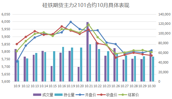 【期货行情】10月硅铁期货主力2010合约先升后降,月开盘价5,734,最高价6,046,最低价5,704,收盘价5,774,结算价5,796,持仓量52,118,成交量960,573。