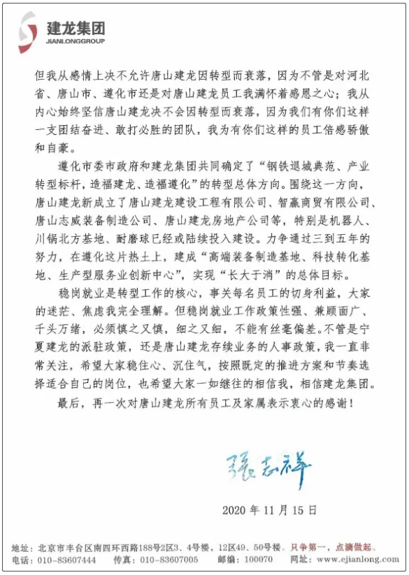 中国铁合金网讯:2020年11月15日,按照河北省、唐山市相关政策的要求,唐山建龙有序关停了冶炼等相关工序,这是唐山建龙特殊意义上的历史时刻。集团董事长、总裁张志祥特地写给唐山建龙全体员工一封信,以表达对所有员工及家属的衷心感谢。
