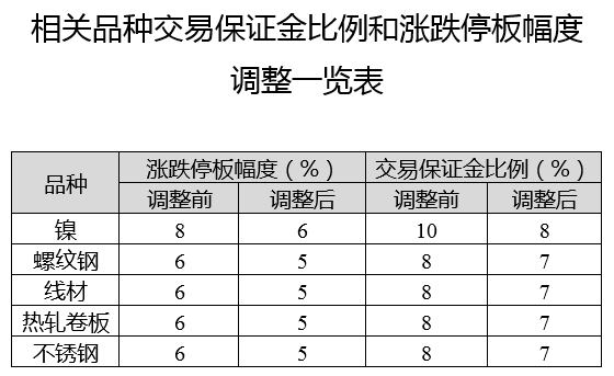 螺纹钢、线材、热轧卷板、不锈钢期货合约的交易保证金比例调整为7%,涨跌停板幅度调整为5%;