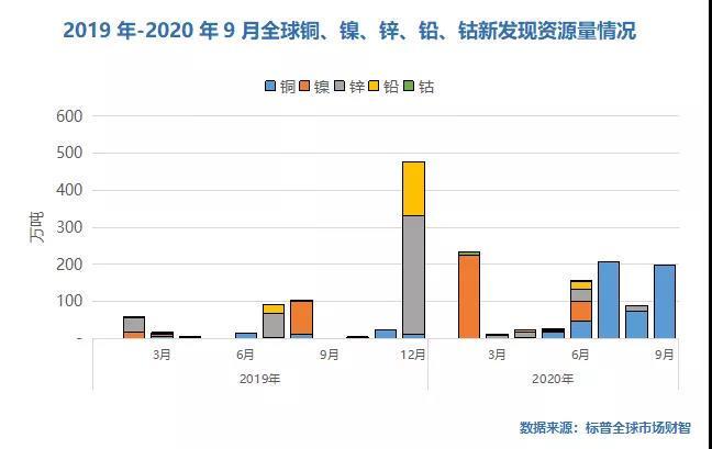 镍、银新发现资源量大幅提升。2020年1-9月新发现镍资源量275万吨,银资源量9642吨,分别是2019年镍和银新发现资源量的2.39倍和2.42倍。