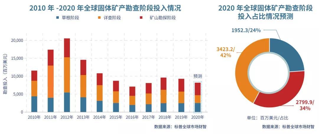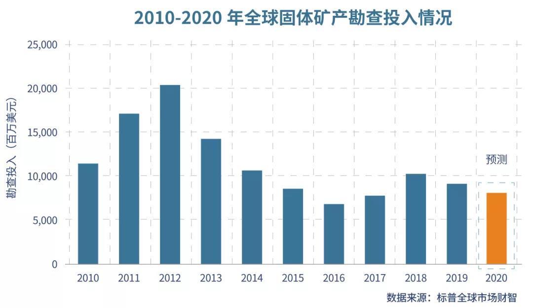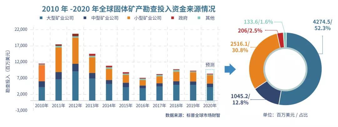 据标普预测,2020年大型矿业公司勘查投入约42.7亿美元,占比超过50%,中型和小型公司勘查投入占比将分别为12.8%和30.8%。