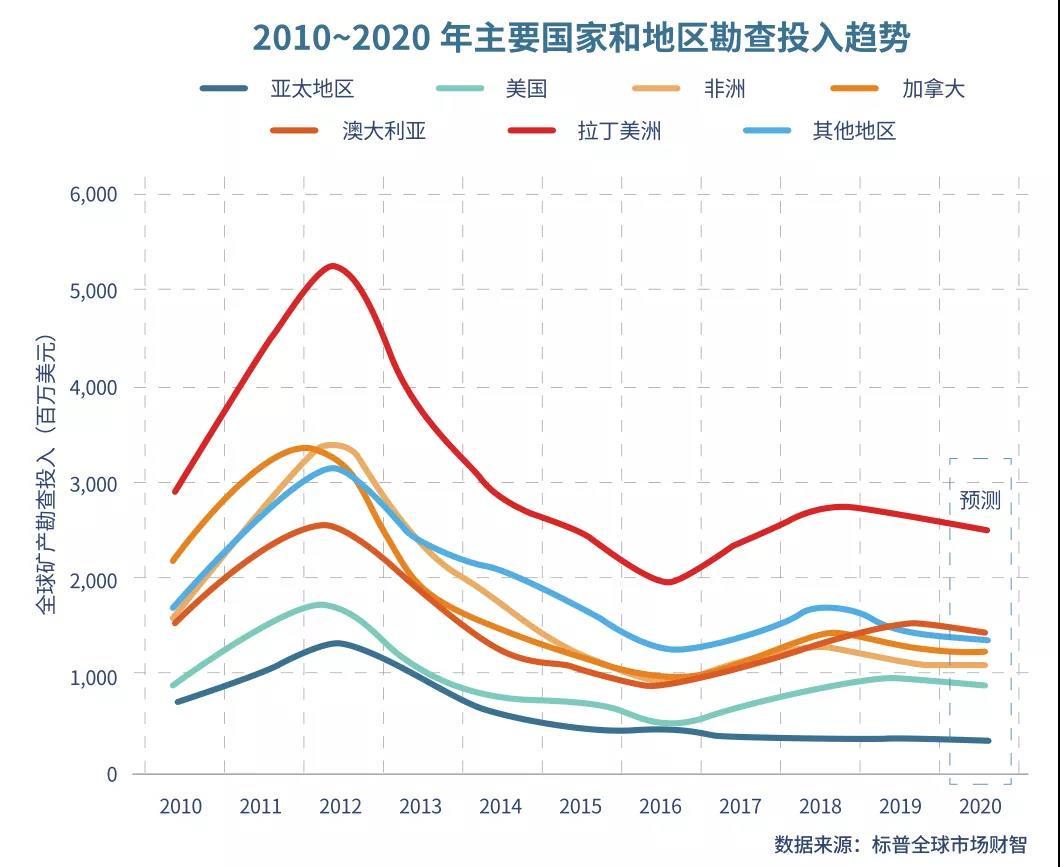 据标普预测,2020年非洲、澳大利亚、加拿大、拉丁美洲、亚太地区和美国固体矿产勘查投入约分别为10.2亿美元、13.8亿美元、11.8亿美元、20.4亿美元、2.9亿美元和9.2亿美元。