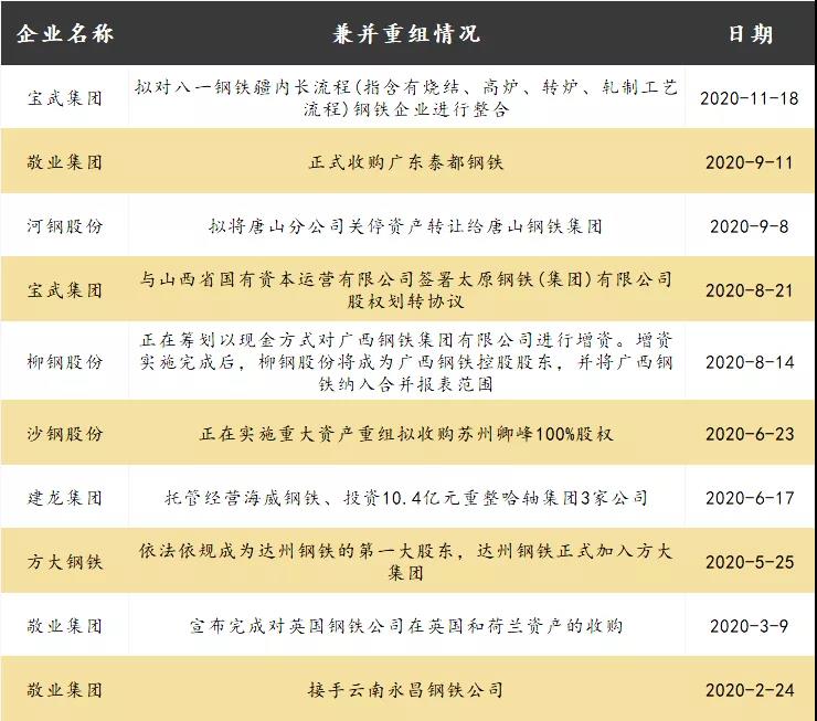 2020年以来,我国钢铁行业兼并重组进入快车道,钢铁企业兼并重组明显提速,其中国企宝钢、民企敬业钢铁等均是动作频频。(详情可见以下名单)
