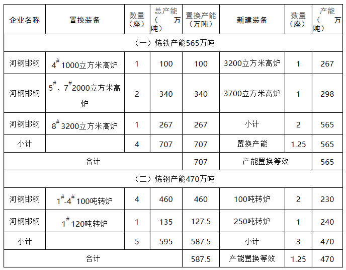 (一)邯钢老区拟退出现有冶炼装备及产能:1座1000立方米高炉、2座2000立方米高炉、1座3200立方米高炉和4座100吨转炉、1座120吨转炉(均在《河北省化解钢铁过剩产能实施方案》<冀政呈〔2016〕20号>中钢铁企业冶炼设备范围之内)。按照《钢铁行业产能置换实施方案》(工信部原〔2017〕337号)规定的产能换算标准,核定炼铁产能707万吨、炼钢产能595万吨。根据省工业和信息化厅2019年10月11日公告的《河钢邯钢老区退城整合项目产能置换方案》,用于置换炼铁产能707万吨、炼钢产能587.5万吨,剩余7.5万吨炼钢产能由河钢集团邯钢公司保留。