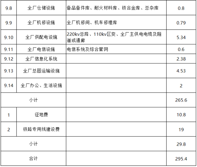 邯钢老区退城整合项目总投资估算295.4亿元,其中工程直接投资265.6亿元、征地及外围设施投资29.8亿元。(详见表2)