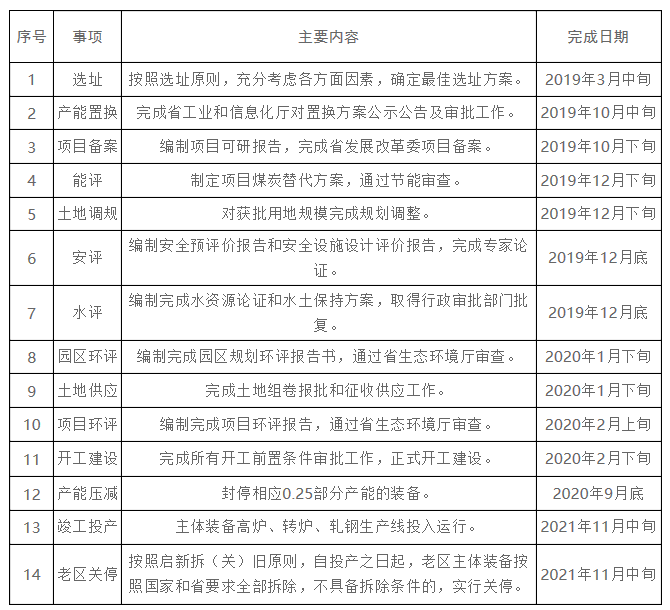 按照“一年筹备,一年九个月建成投产”实施计划完成项目建设,2019年3月份完成项目选址,2019年10月份完成产能置换审批、项目备案,2019年12月份完成能评、安评、水评、土地调规,力争2020年1月份完成园区环评、土地供应,2020年2月份完成项目环评审查,正式开工建设,2020年9月底完成封停0.25部分产能装备,2021年11月份建成投产并关停拆除老区相应冶炼装备。(详见表3)