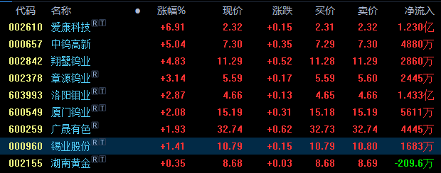 截止本周五收盘,钨上市公司全部上涨,具体为:爱康科技涨近7%,中钨高新涨超5%,翔鹭钨业涨近5%,章源钨业涨超3%,洛阳钼业涨近3%,厦门钨业涨超2%,广晟有色涨近2%,锡业股份涨超1%,湖南黄金涨幅不足1%。