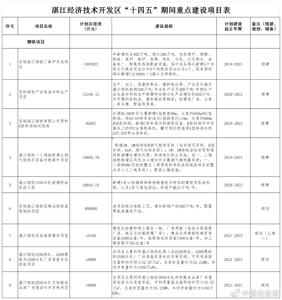其中,湛江经开区“十四五”期间拟重点建设钢铁项目如下表: