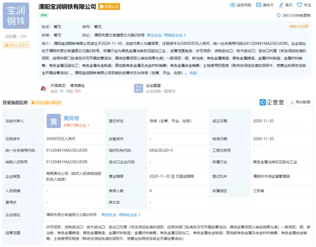 据企查查官网信息显示,2020年11月30日,溧阳宝润钢铁有限公司注册成立,江苏德龙镍业有限公司100%控股。