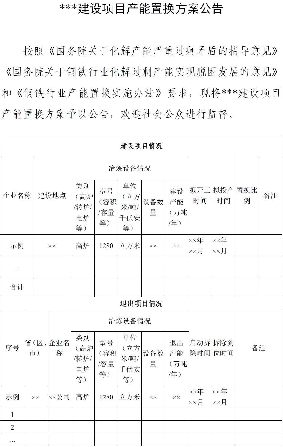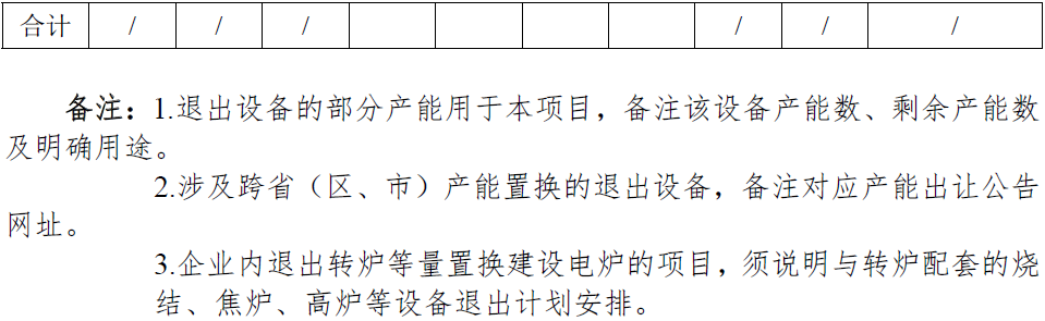 (二)退出项目所在地区、企业名称、退出的冶炼设备型号、数量和产能,拆除时间安排。涉及跨省(区、市)产能置换,须附产能出让公告(附件2)。