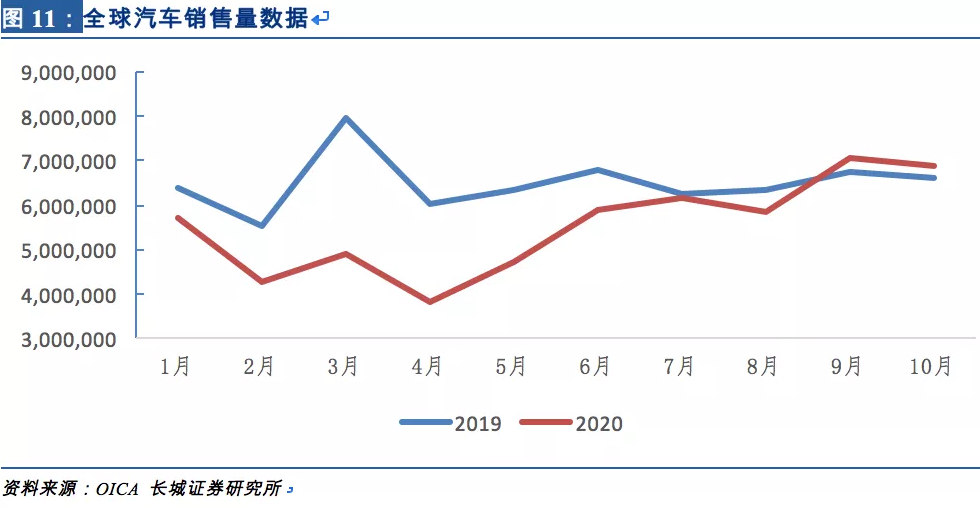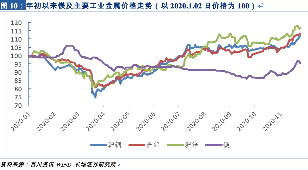2. 与铜铝等工业金属需求主要在国内不同,镁主要需求在于汽车领域,而汽车生产主要位于海外。随着国内疫情先于海外得到控制,国内经济也先于海外恢复,因此4月份起国内工业金属价格不断修复;但海外疫情未得到控制的背景下,Q2海外车企尽管部分开工,但开工率较低,且消费领域由于封锁政策表现疲软,车企排产有限,镁价并未出现明显反弹。随着海外疫情逐渐得到控制,9、10月份全球汽车销售数据同比恢复正增长,海外车企排产动力有所提升,开工率回升,镁价才出现明显底部反弹趋势。