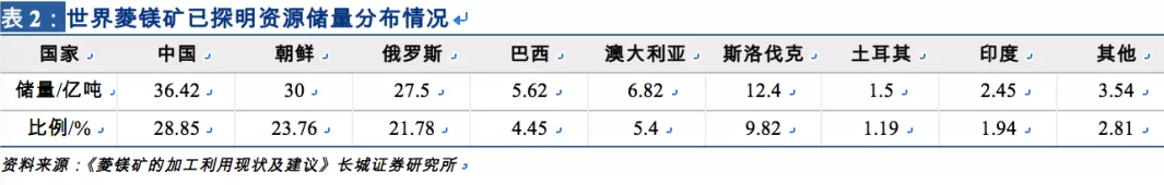 我国菱镁矿探明储量的矿区27处,分布于9个省(区),以辽宁菱镁矿储量最为丰富,主要集中于营口至大石桥至海城一带。其次是山东,此外,西藏、新疆、甘肃等地区菱镁矿也较丰富。而且我国菱镁矿的主要资源特点是储量相对集中,大型矿床较多;矿床类型较为单一,主要是积变质-热液交代型菱镁矿;特别是辽宁省的矿石品质优良,一般MgO的含量都在46%~47%。