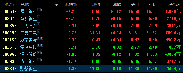 截止本周五收盘,钨上市公司涨多跌少,具体为:厦门钨业涨超7%,章源钨业涨近3%,中钨高新涨超2%,广晟有色涨近1%,湖南黄金涨幅不足1%,爱康科技跌幅不足1%,锡业股份、洛阳钼业、翔鹭钨业跌超1%,