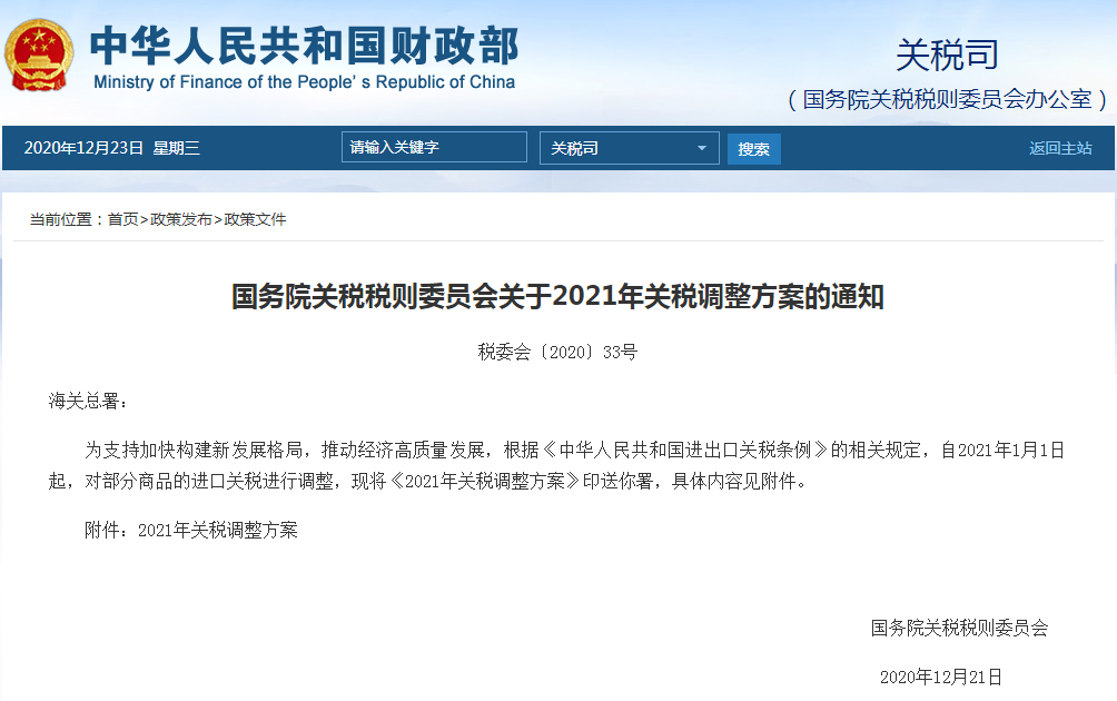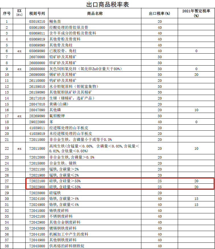 中国铁合金网讯:国务院关税税则委员会日前发布关于2021年关税调整方案的通知,硅铁出口暂定税率维持20%不变,自2021年1月1日起施行。