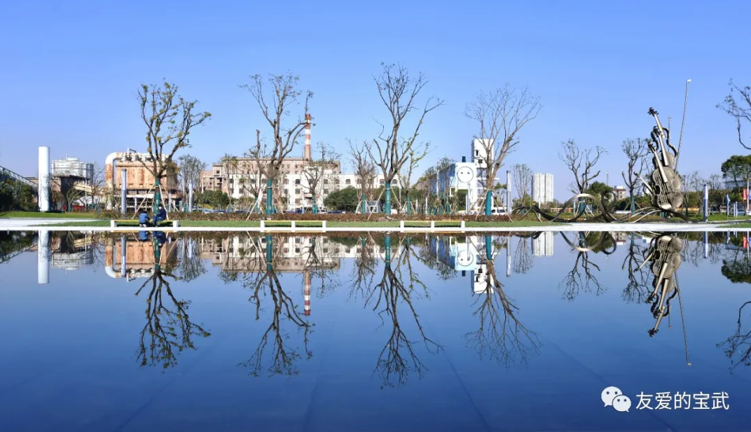 会博中心正对面是主要景观展示区域——象征着“钢之荣耀·铁聚百川”的荣耀广场。广场中央的镜面水池、由水塔改造而成的虹塔、由小提琴曲《金色的炉台》为构思源泉所创作的雕塑“经典演绎”等构成了集景观、雕塑、绿化、休闲于一体的广场空间。