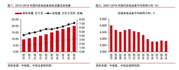 在装机快速增长、经济整体增速拾级而下、能源使用效率提升、高耗能行业产能受到政府限制等系列因素共同推动下,国内电力市场近年呈现整体过剩局面,发电设备利用小时趋势性下行。2007年,国内发电设备的平均利用小时为5,011小时,2019年已经回落至3,825小时,降幅接近1,200小时。