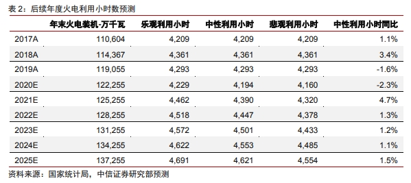 预计2021~2023年煤电利用小时数分别同比增长5%/1%/1%