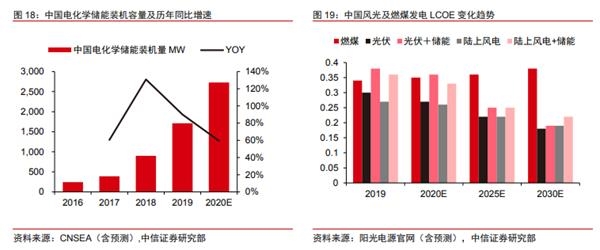 目前制约储能技术大规模推广的成本问题预计随着技术发展将得到逐步解决。根据 BNEF 测算,全球储能 LCOE(平准化度电成本)已经从约 600 美元/MWh 降低至 150 美元/MWh,后续仍有较大下降空间。目前我国风光+储能 LCOE 仍略高于火电,预计2021年将实现与火电基本平价,未来随着水系电池/液流电池等新技术的大规模推广,经济性仍将持续提升。随着储能设施的大规模建设,未来光伏/风电等可再生能源的发电的稳定性将得到有效提升。