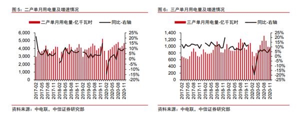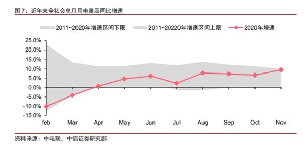 用电需求增速持续上行,11月单月用电增速已经接近10年历史高位。在上述因素的综合影响下,今年以来全社会用电量在摆脱年初疫情期间的低谷之后,单月增速屡创新高。5月以来,除了7月发生历史级洪涝灾害影响开工之外,其余月份单月全社会用电量增速全部高于 5%。11月,全社会用电量增速高达9.4%,较10月的6.6%进一步抬升2.8个百分点,体现电力需求的加速向好。撇除春节及年末等不可比口径之后,9.4%的单月增速是2011年以来历史第二高的单月最高增速,仅次于2011年的9.91%。