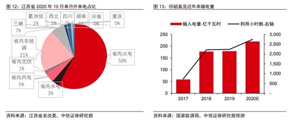 中部省份外来电输入不足,电网冗余度尤其偏低。对于各省而言,特高压输送的外来电是省内机组的重要补充,也是电力系统装机冗余度的重要来源。对于湖南、江西等中部省份而言,当前外来输电通道建设普遍不足,导致冬季用电紧张时缺乏后备力量。其中, 湖南的主要外来电通道祁韶直流多年来送电量不达预期,近年来线路利用小时数不到3,000小时,且祁韶直流的送电基地绝大多数为风电光伏装机,基地内常乐火电未能建成, 本身出力稳定性即有不足。江西目前没有重点外来电通道,仅以三峡、葛洲坝、四川等地的零星电量为主,唯有待雅砻江中游的杨房沟投产后,方可经由雅中直流将更多电量送入江西。