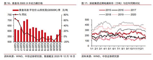 浙江电煤库存充足,证伪“缺煤”猜测。参考本轮限电省份之一的浙江,我们注意到当地国企浙能集团的电煤库存在2020年整体高于往年水平,尤其是在2020年11月底以来的3周自360万吨大幅上升至400万吨以上,较往年高出约60万吨。浙能集团最新的电煤库存可用天数超过32天,较2019年同期的25~28天亦有显著增长。