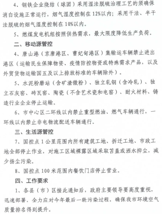 禁止国四及以下重型载货汽车(含燃气)进行运输。除城市运行(含电力企业生产用煤、粉煤灰渣运输,企业环保设施正常运行所需石膏、尿素、石灰石、酸碱及保证安全生产运行物资运输、民生保障物资或特殊需求产品运输)保障车辆和执行任务特种车辆外,原则上市主城区、县(市、区)建成区内禁止重型和中型货车、三轮汽车、低速载货汽车和拖拉机通行。施工工地、工业企业厂区和工业园区内停止使用国二及以下非道路移动机械。